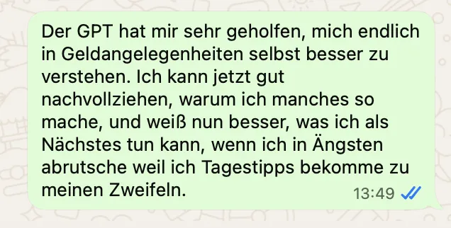 Der GPT bleibt nicht bei einer Analyse stehen. Du kannst ihn immer wieder nutzen, um neue Geldfragen zu prüfen, sobald sie im Alltag auftauchen.